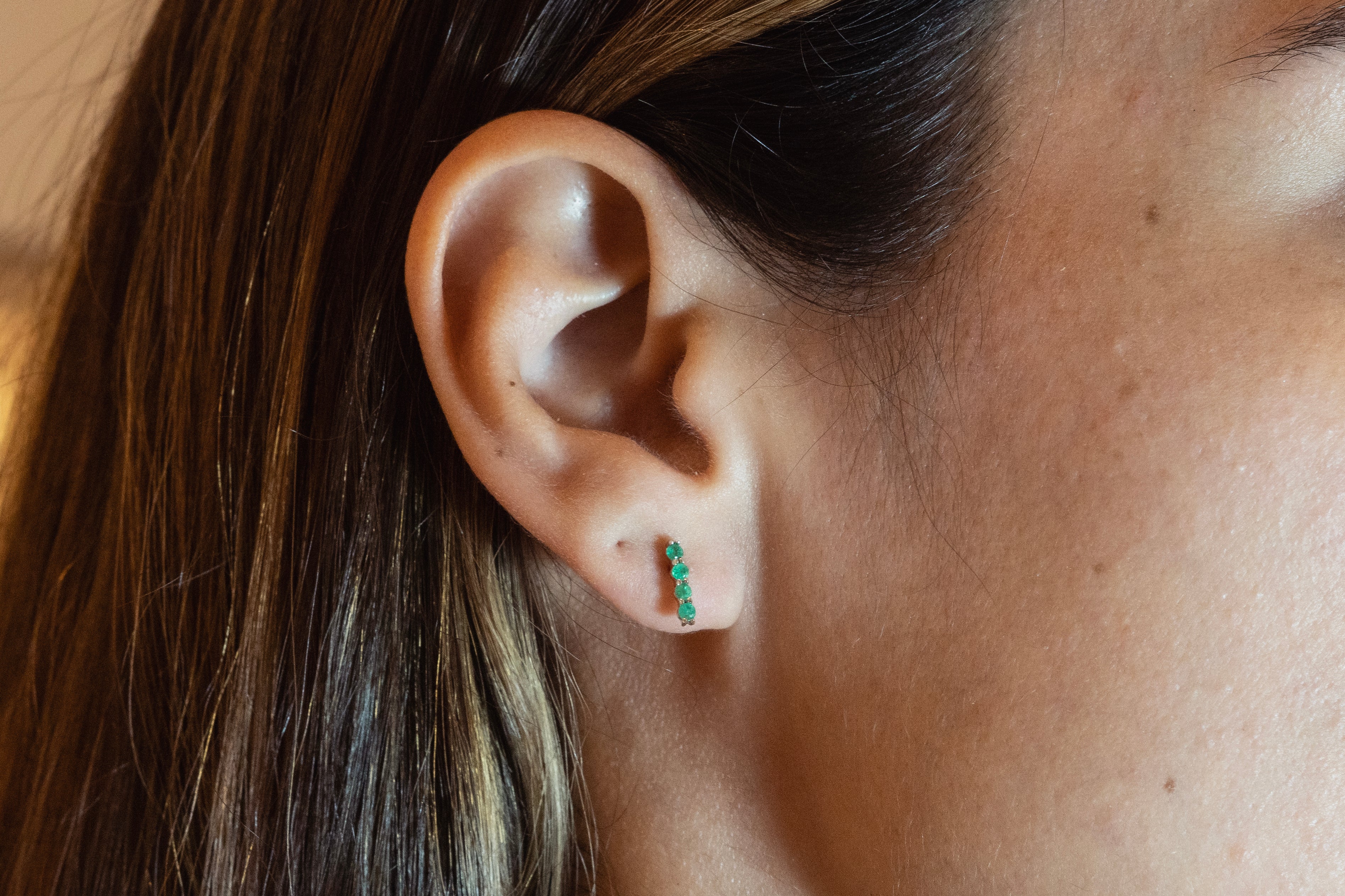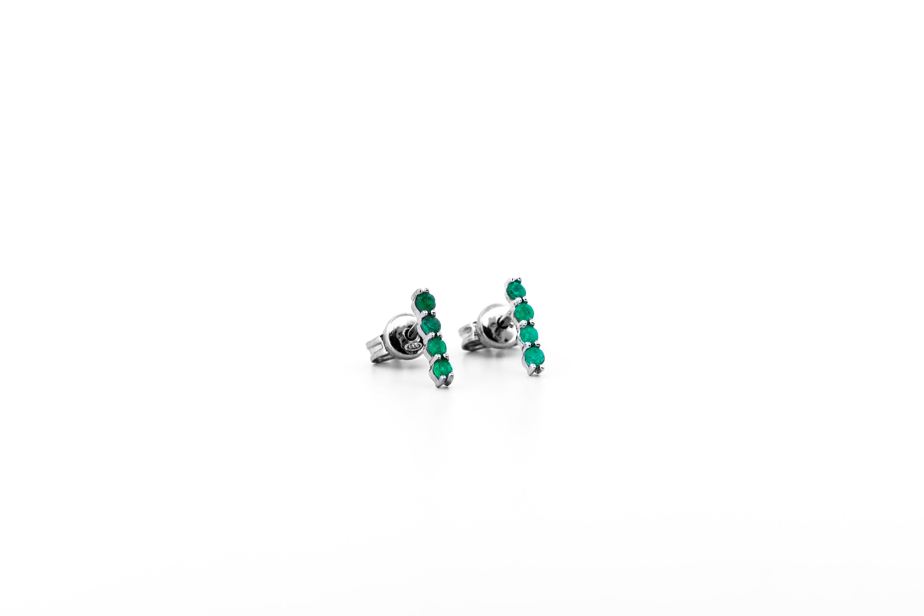 Aretes en plata rodinada ley 925 con esmeralda colombiana. Dimensiones aprox: 10x2mm